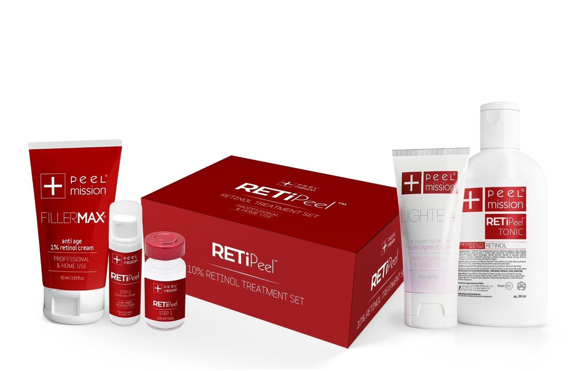 - pierwszy etap to zabieg w gabinecie, którego kluczowym elementem jest spotęgowany kompleks retinolu o najwyższym stężeniu 10%, wzmocniony unikalną kompilacją kwasów AHA. Wpływa na głębsze warstwy skóry, inicjując procesy naprawcze, przyczynia się do przywrócenia jędrności, napięcia i gęstości skóry.
